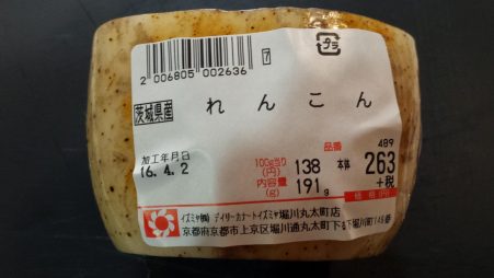Je choisis de tester un légume cultivé au Japon, le れんこん (renkon). À prononcer “laineconne”, sinon ça sonne tout de suite moins bien. Il me semble que c’est une racine de lotus, quelque chose comme ça. C’est presque ça! Google me dit que c’est du rhizome de lotus et qu’il faut l’éplucher.